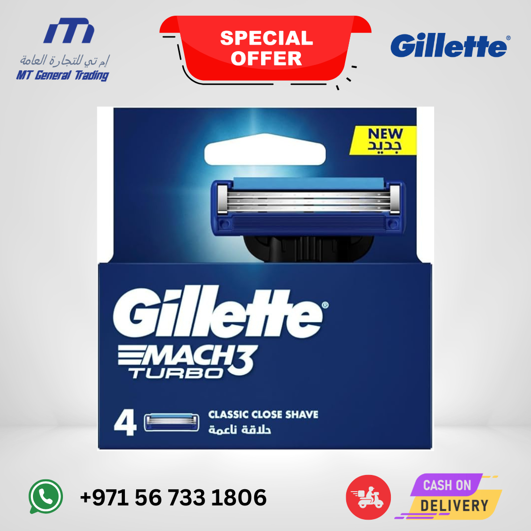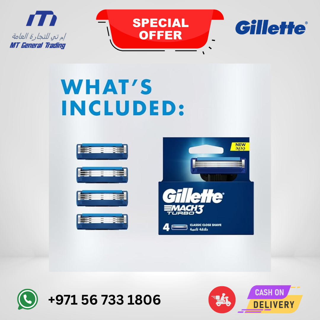 Pack includes 4 Gillette Mach3 Turbo refill cartridges
